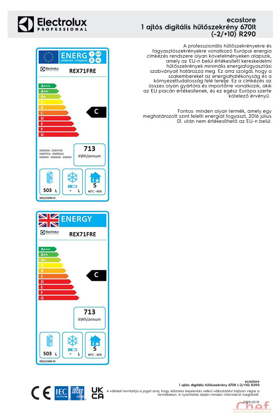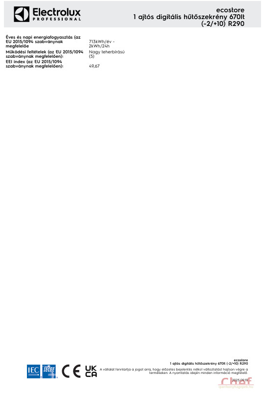 Éves és napi energiafogyasztás (az EU 2015/1094 szabványnak megfelelőe 713kWh/év - 2kWh/24h