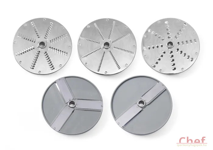 5 vágótárcsa mellékelve: 2 mm-es szeletek (3 pengés tárcsa), 4 mm-es szeletek (3 pengés tárcsa), 3 mm-es reszelő, 4,5 mm-es reszelő, 7 mm-es reszelő, kidobótárcsa.